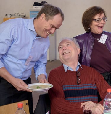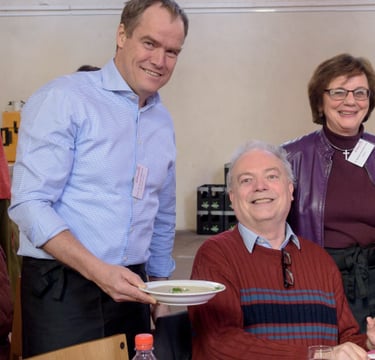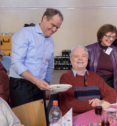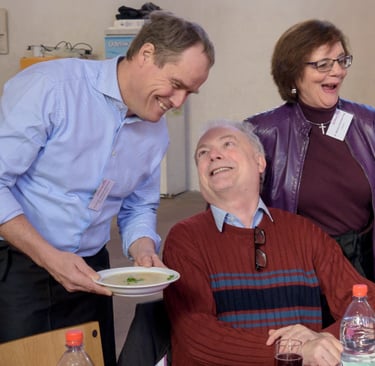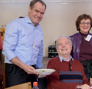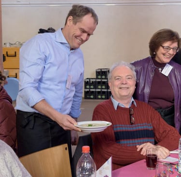 Lutherjahr 2017: Fototermin für die Rhein-Neckar-Zeitung Heidelberg bei einem Festakt in der Heidelberger Heiliggeistkirche: Oberbürgermeister Eckehard Würzner serviert Berthold Schlegel eine Suppe.
